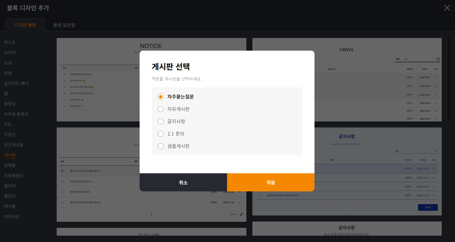 여기에 블록추가 > 디자인 선택 화면 > 게시판 블록을 추가하시면 어떤 노출할 게시판을 선택할 수 있습니다.