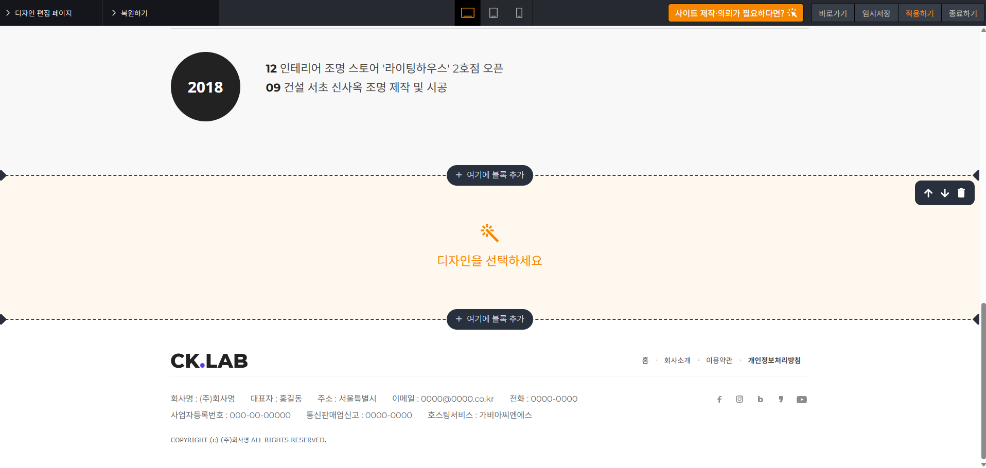 사이트 관리 > 페이지 메뉴로 접속해 게시판을 노출할 페이지의 디자인 모드로 접속합니다.