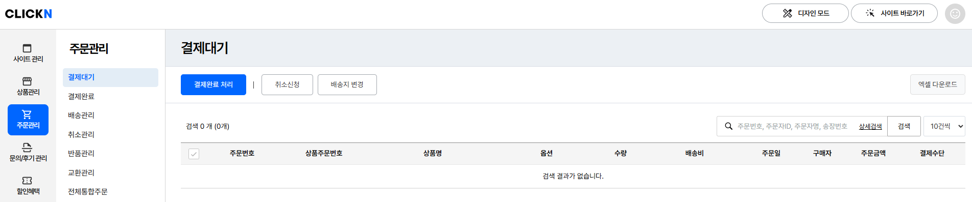 무통장 결제 수단으로 주문을 진행한 경우 결제 대기 상태로 주문이 수집되며,