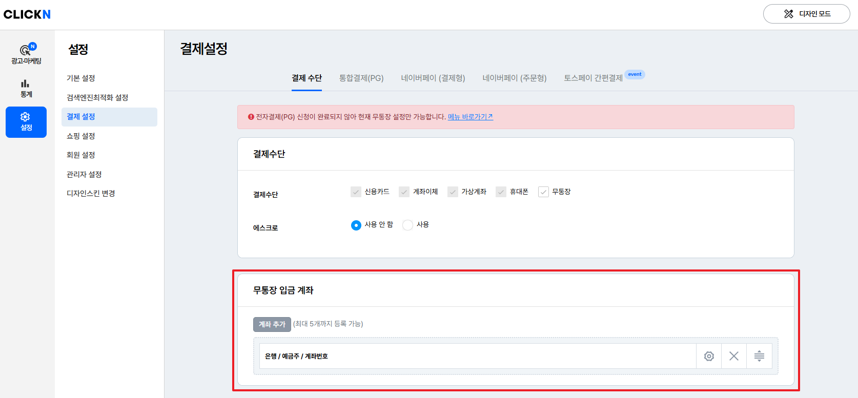 관리자 페이지 > 설정 > 결제 설정 > 무통장 입금 계좌 추가