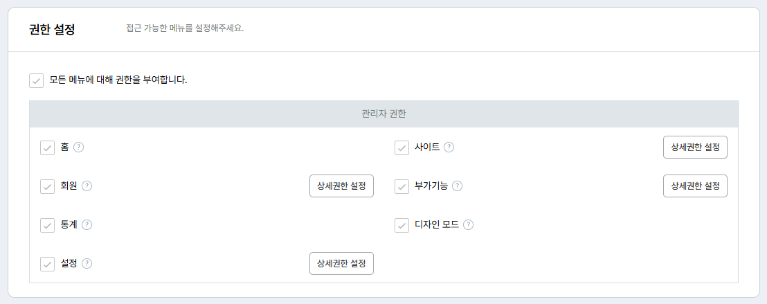 추가한 부관리자의 접근 권한을 설정할 수 있습니다.