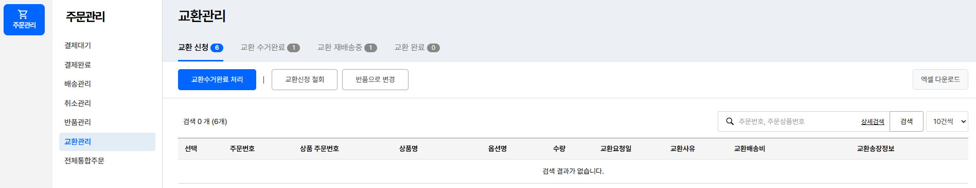 상품이 발송된 이후 구매자가 [교환 신청] 을 진행했다면 쇼핑몰 관리자는 [교환 관리] 메뉴에서 접수된 교환 신청 내역을 확인하고 반품 수거 완료, 재배송, 교환 완료 처리를 진행할 수 있습니다.