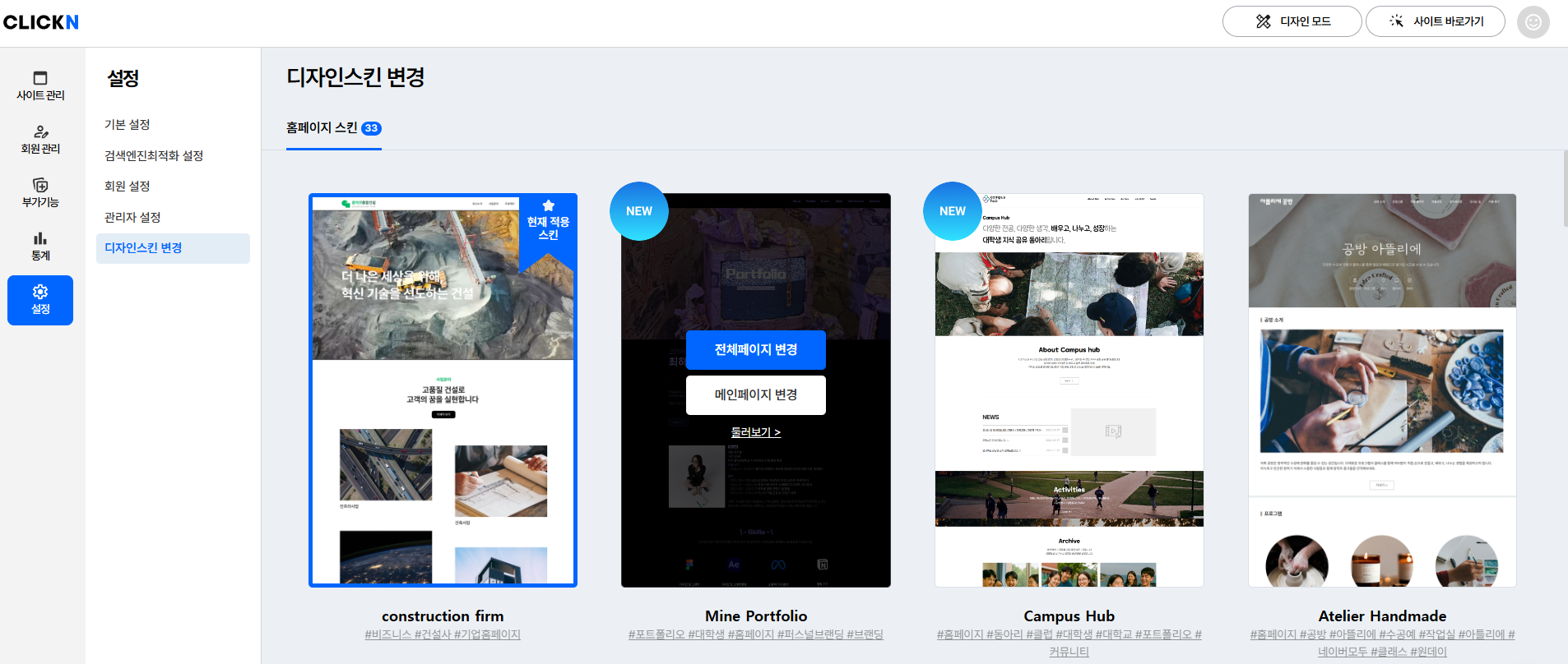 전체 페이지 변경은 현재 이용중인 사이트의 전체 디자인을 선택한 스킨으로 변경할 수 있어요.