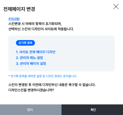 전체 페이지 변경시 사이트의 모든 디자인과 페이지, 메뉴 설정이 선택한 스킨으로 변경되며 기존에 설정해둔 이전 디자인으로 복구할 수 없습니다.