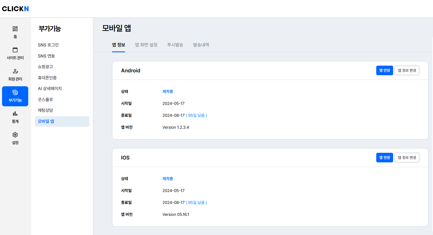 클릭엔 홈페이지 > MY클릭엔 > 더보기 > 모바일 앱