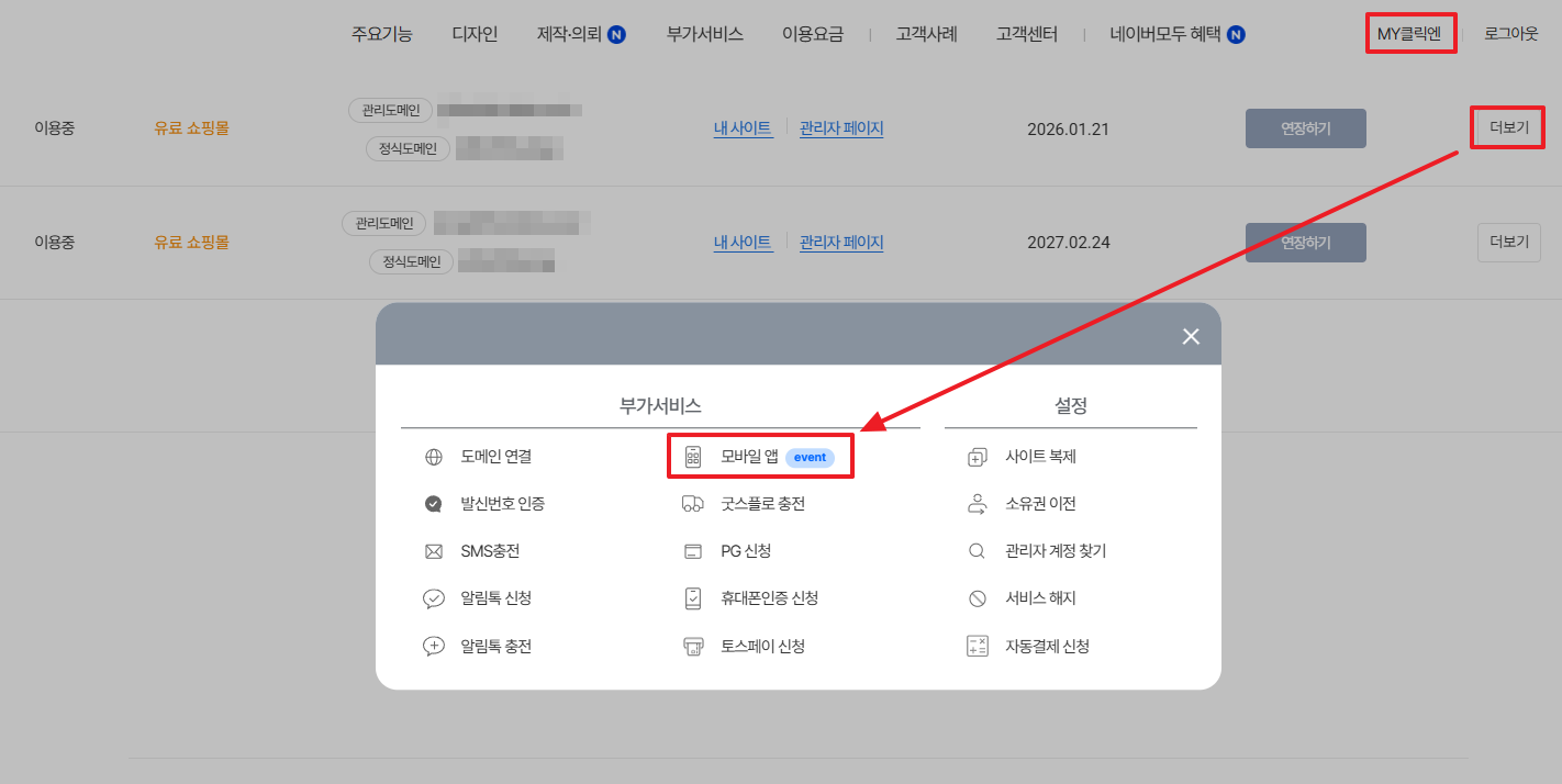 MY클릭엔 > 유료신청 메뉴를 통해 사이트를 연장해 주세요.