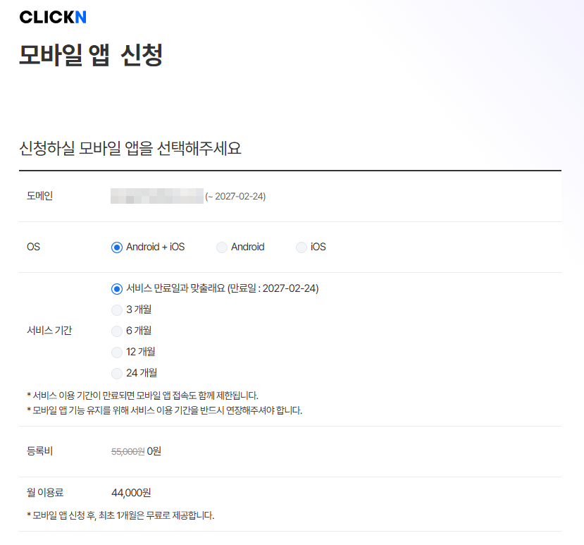 모든 사전준비가 완료되었다면 클릭엔 홈페이지에서 앱 제작을 신청할 수 있어요.