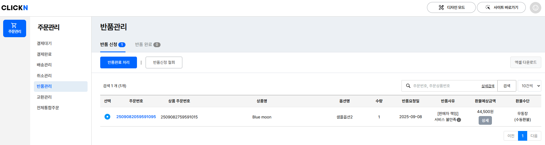 상품이 발송된 이후 구매자가 [반품 신청] 한 경우 관리자는 쇼핑몰의 정책에 따라 반품 받은 상품을 확인하고 [반품 관리] 메뉴에서 [반품 완료 처리]를 진행할 수 있습니다.