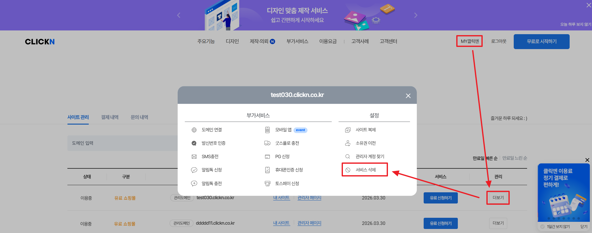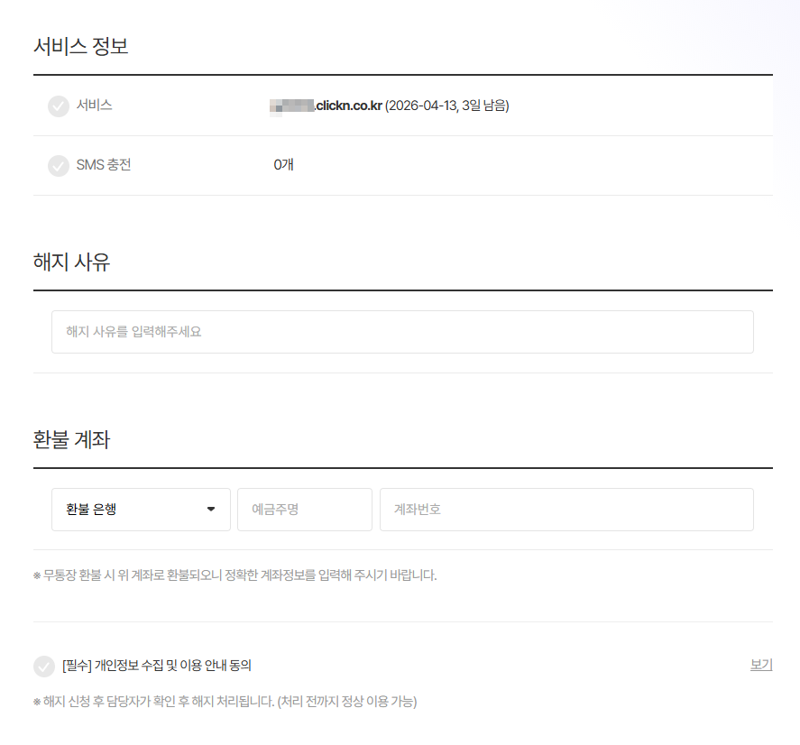 MY클릭엔 > 사이트 우측 더보기 > 서비스 삭제 or 해지
