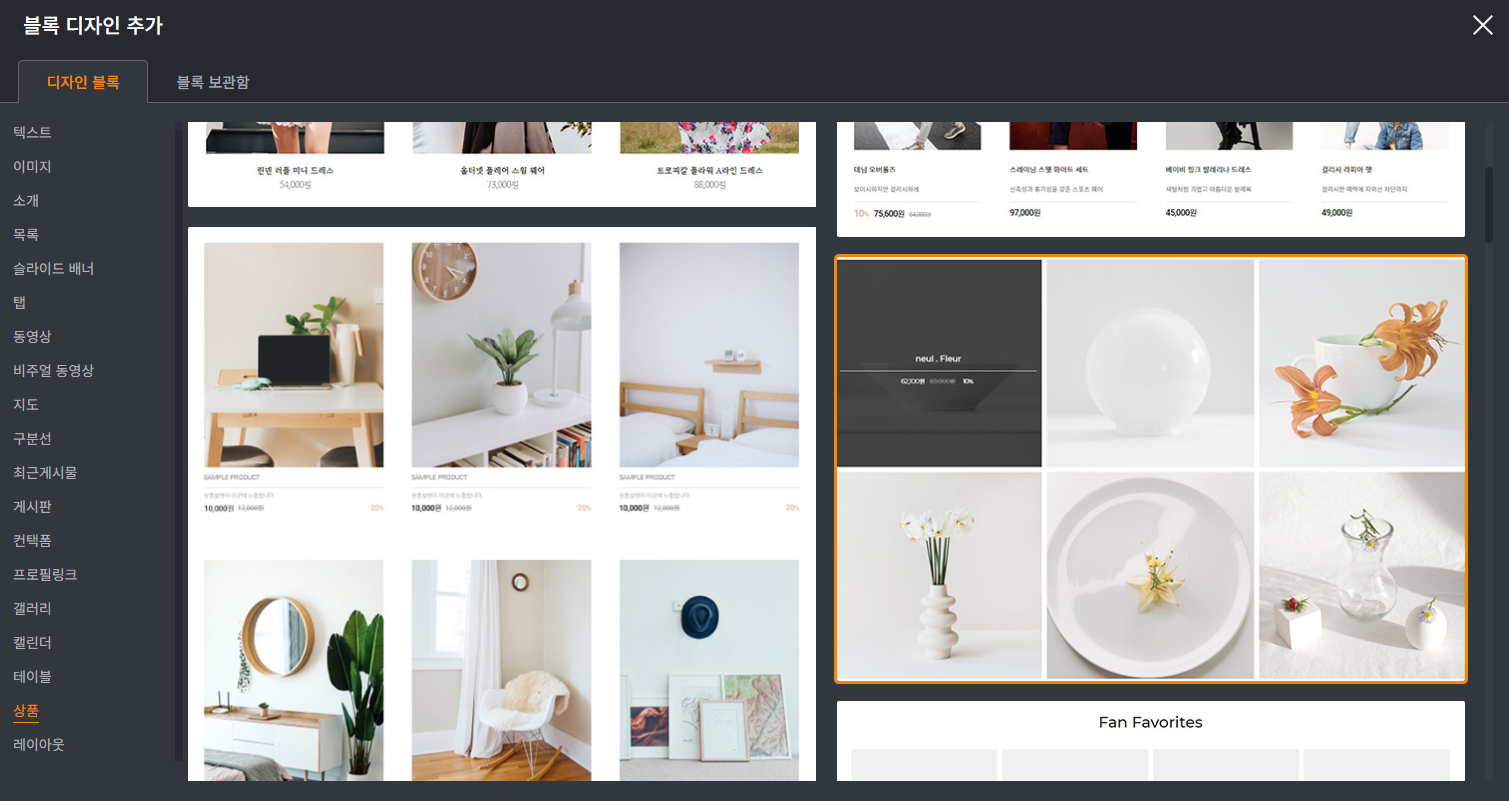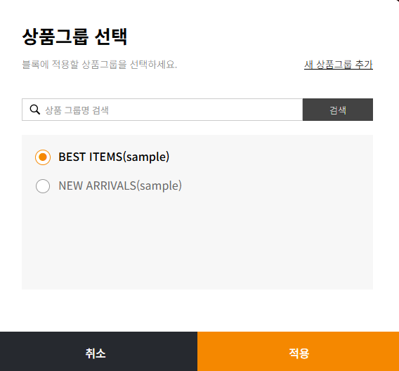 상품그룹은 블록 형태로 추가할 수 있어 웹 사이트에서 원하는 위치에 상품 블록을 추가해 노출 할 수 있어요.