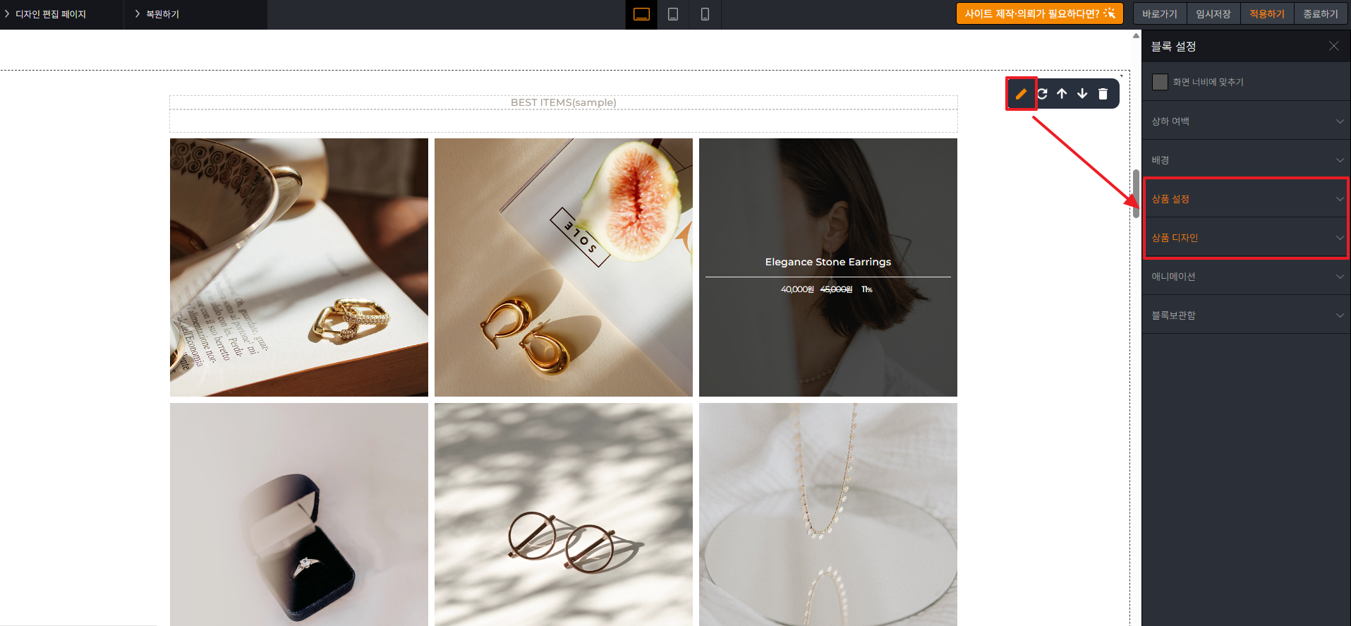 상품 블록 추가 후 블록 설정 으로 접속하여 노출할 상품의 정보, 가로/ 세로 개수, 상품 이미지 라운딩 설정 등의 상품 블록의 상세 디자인을 수정할 수 있어요.