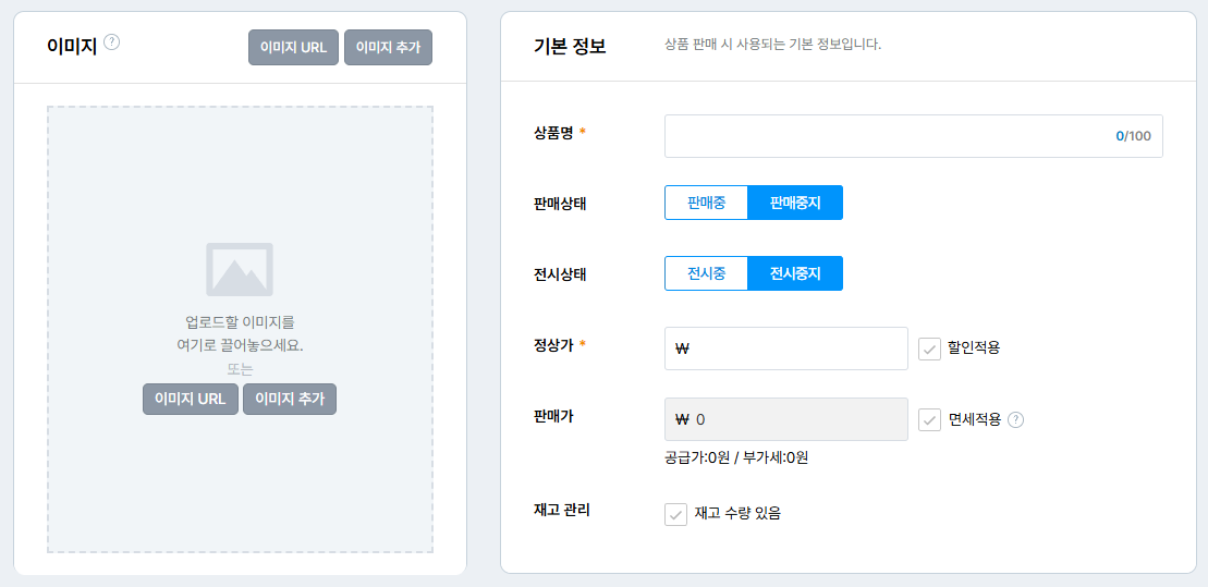 상품 등록을 위한 기본 정보를 입력하는 영역이에요.