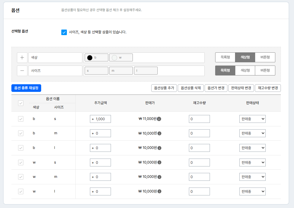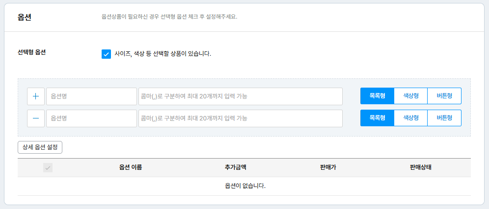 선택형 옵션 : 사이즈, 색상 등 옵션을 사용함으로 설정