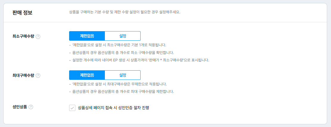 상품을 구매하는 기본 수량 및 제한 수량, 성인 상품으로 설정할 수 있어요.