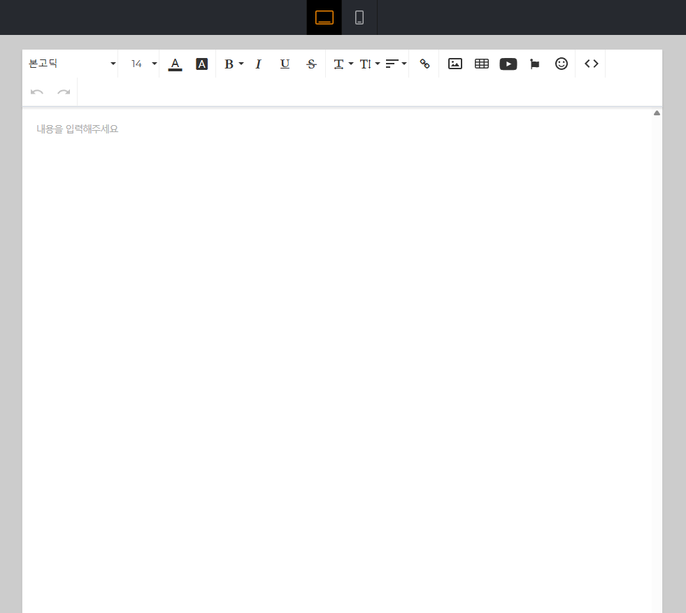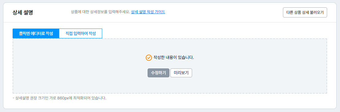 상품의 상세 설명을 입력할 수 있는 영역으로 두가지 방식으로 상품 상세페이지를 작성할 수 있어요.