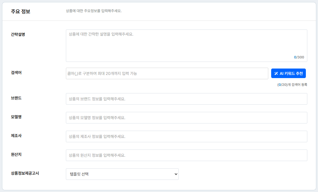 상품에 대한 주요 정보 (간략 설명, 검색어, 브랜드, 상품정보제공고시 등) 를 작성할 수 있는 영역이에요.