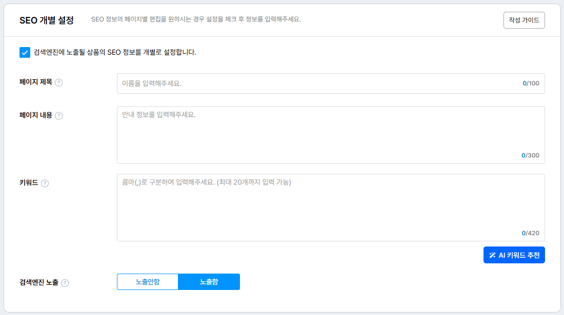 미설정시 상품 정보에 입력하신 정보들이 자동으로 노출되지만, 개별 설정이 필요할 경우 해당 메뉴를 통해 노출하고싶은 정보를 추가로 입력해 주세요.