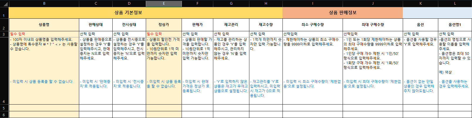 클릭엔의 엑셀 양식에 맞춰 데이터를 입력해주시면 엑셀로 상품을 업로드하실 수 있어요.