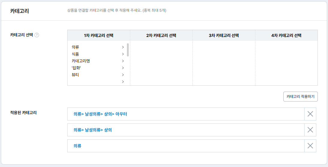 상품의 카테고리를 선택하고 카테고리 적용하기 버튼을 통해 상품의 카테고리를 지정해 주세요.