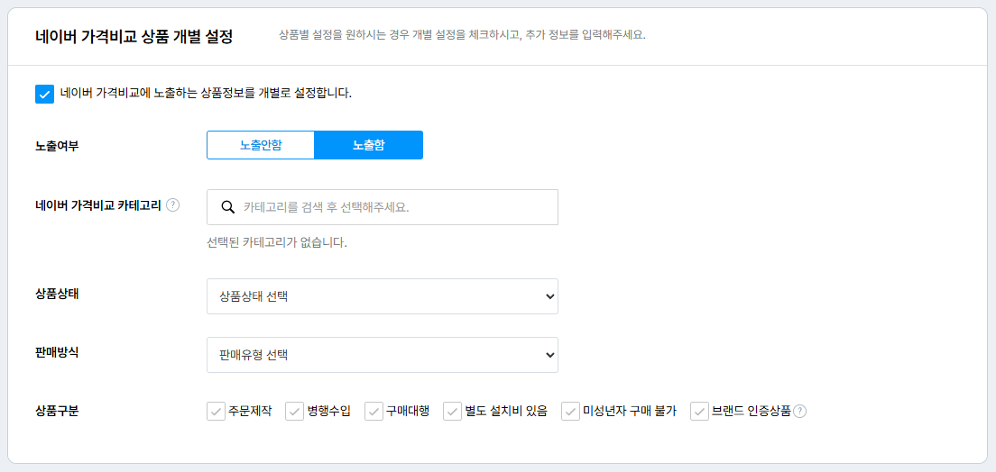 네이버 가격비교에 노출하는 상품 정보가 공통정보가 아닌 경우 개별로 설정할 수 있어요.