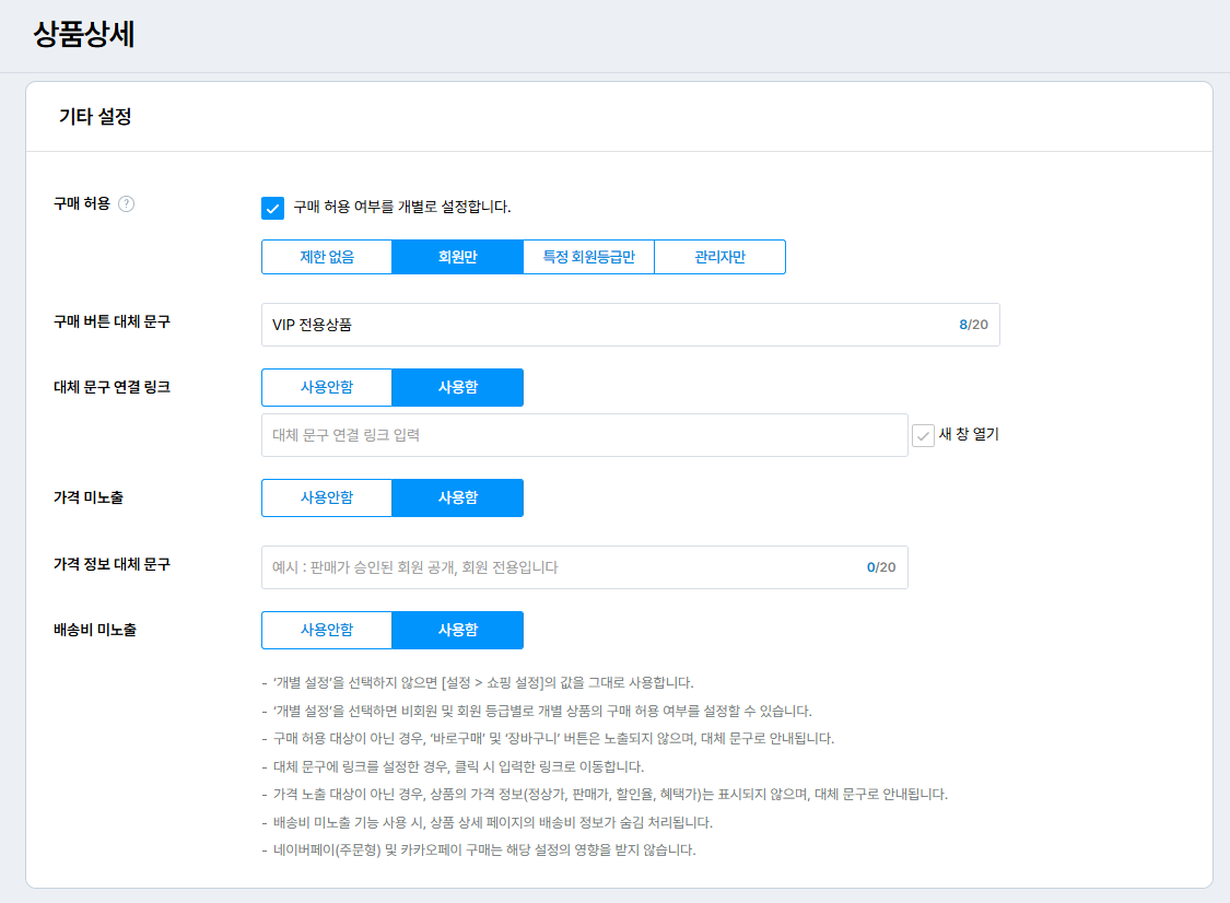 가격 정보 대체 문구 : 상품 금액 대신 노출할 문구를 설정할 수 있어요.