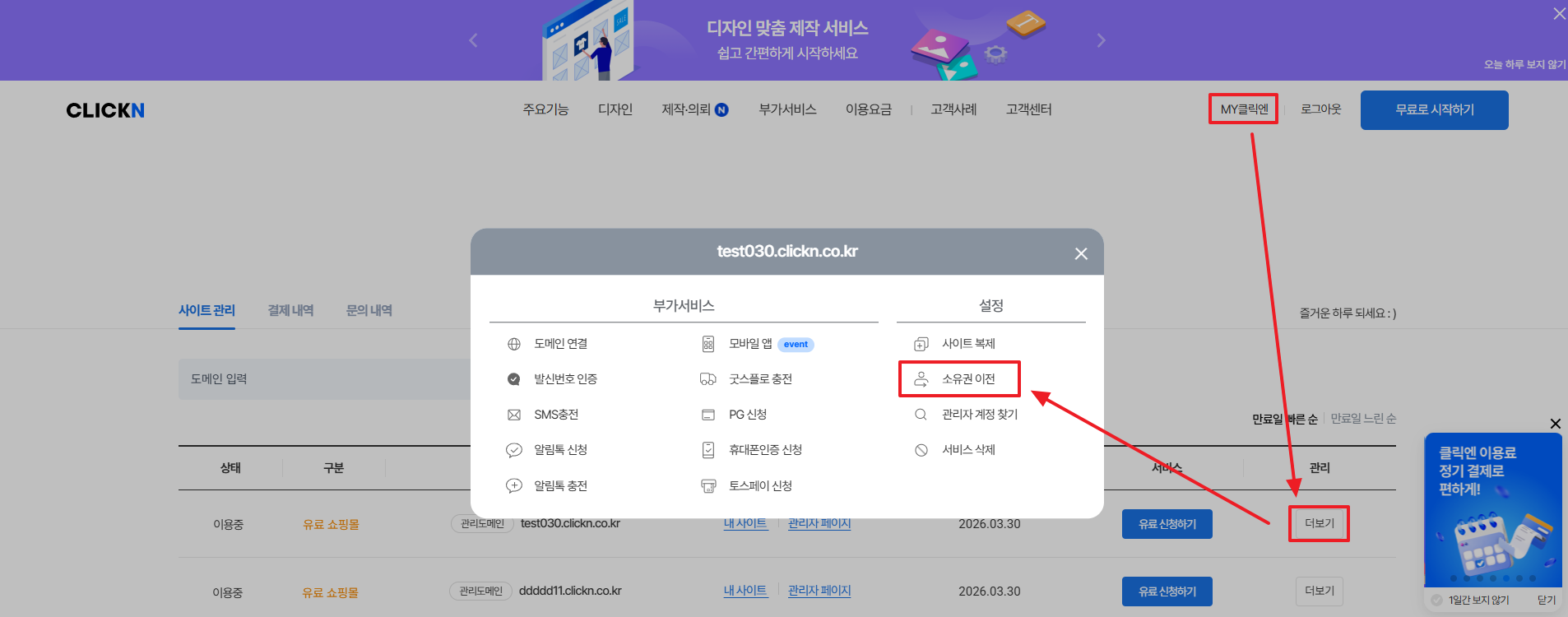 클릭엔 홈페이지 > MY클릭엔 > 더보기 > 소유권 이전