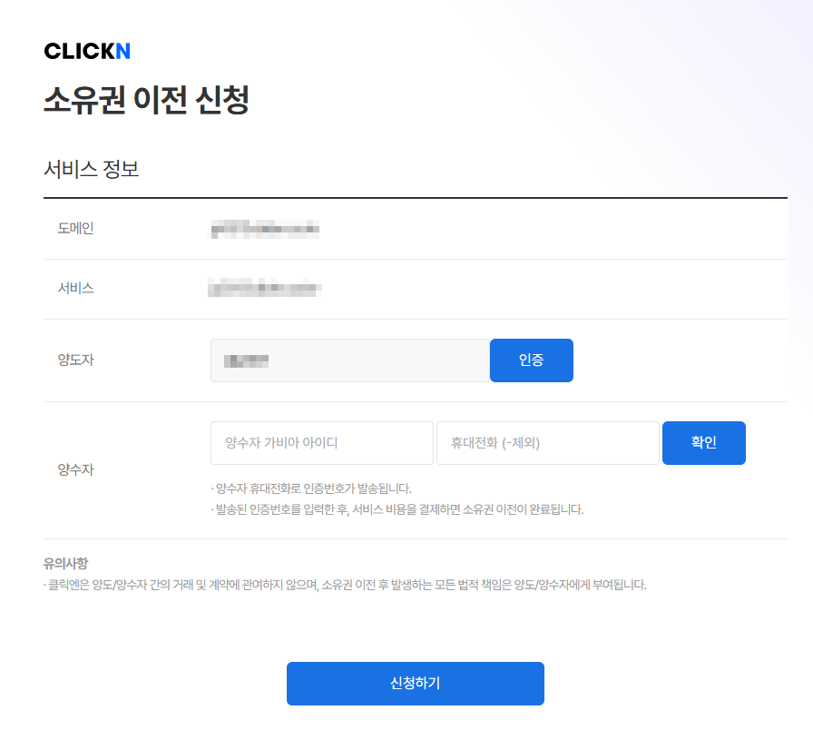 현재 사이트를 소유한 양도자와 사이트를 이전받을 양수자의 인증을 각각 진행해 주세요.