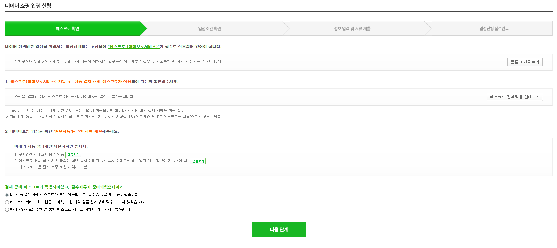 이용약관 확인 및 동의를 진행한 후 에스크로 적용 여부를 체크하고 필수 서류를 준비해 주세요.