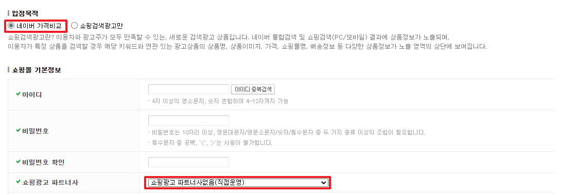 쇼핑광고 파트너사 : 쇼핑광고 파트너사 없음 (직접운영) 선택