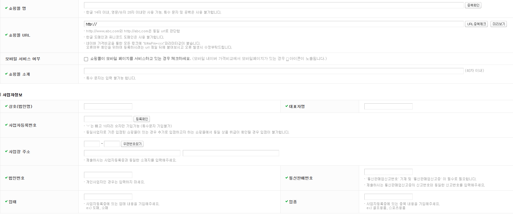 사업자 정보는 쇼핑몰 하단에 노출되고 있는 정보와 동일하게 입력해 주세요.