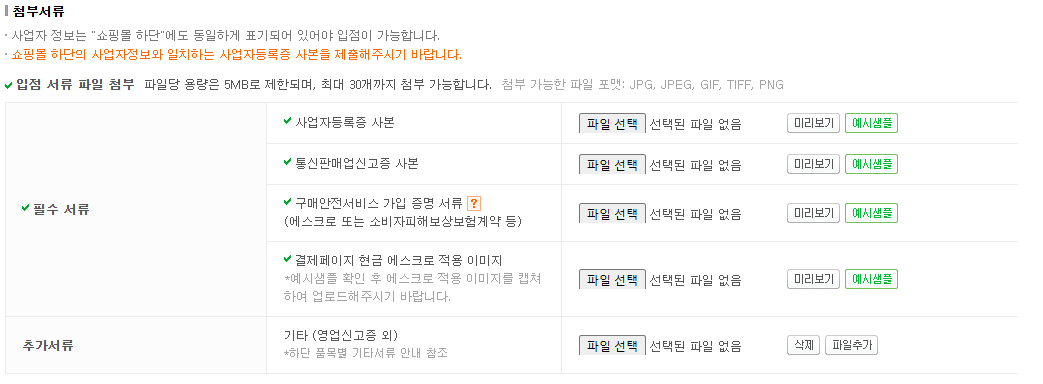 쇼핑몰 정보 및 사업자 정보를 입력하고 제출이 필요한 서류들을 업로드해 주세요.