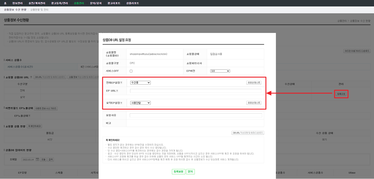 확인한 DB URL은 네이버쇼핑 파트너센터에 입력해 최종 검수를 진행해 주세요.