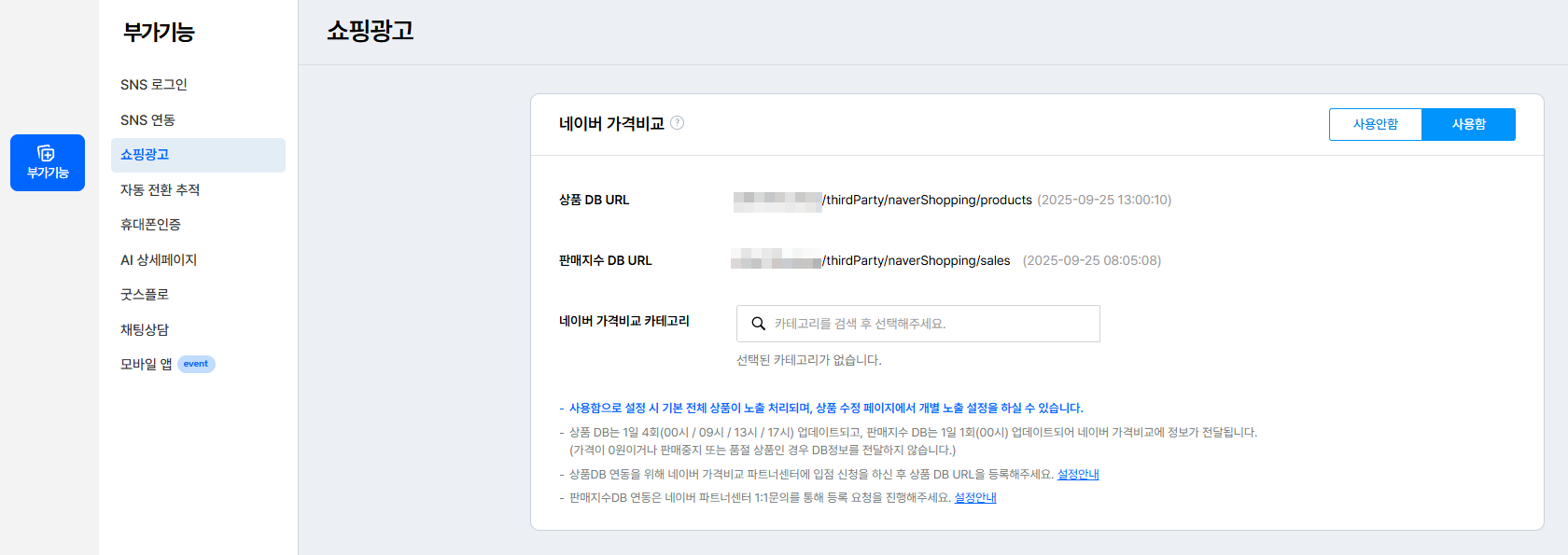 관리자 페이지 > 부가기능 > 쇼핑광고 > 상품 DB URL 확인
