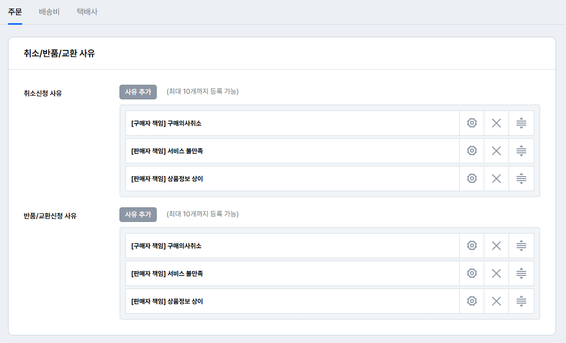 취소 / 반품 / 교환 신청 사유를 추가하거나 수정할 수 있습니다.