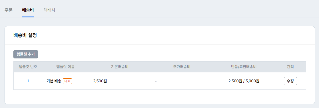 배송비 템플릿을 추가하여 상품별로 배송비를 다르게 부과할 수 있습니다.