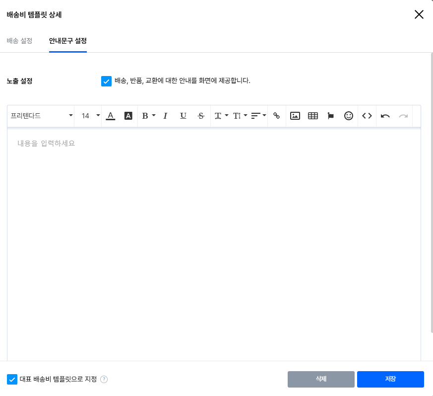 상품 상세페이지 내에서 공통으로 노출되는 배송 / 반품 / 교환에 대한 안내 문구를 설정할 수 있어요.