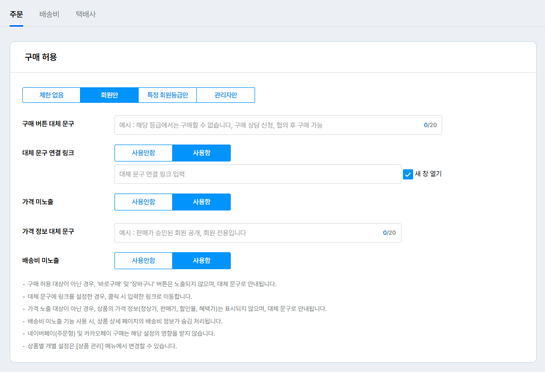 가격 정보 대체 문구 : 상품 금액 대신 노출할 문구를 설정할 수 있어요.