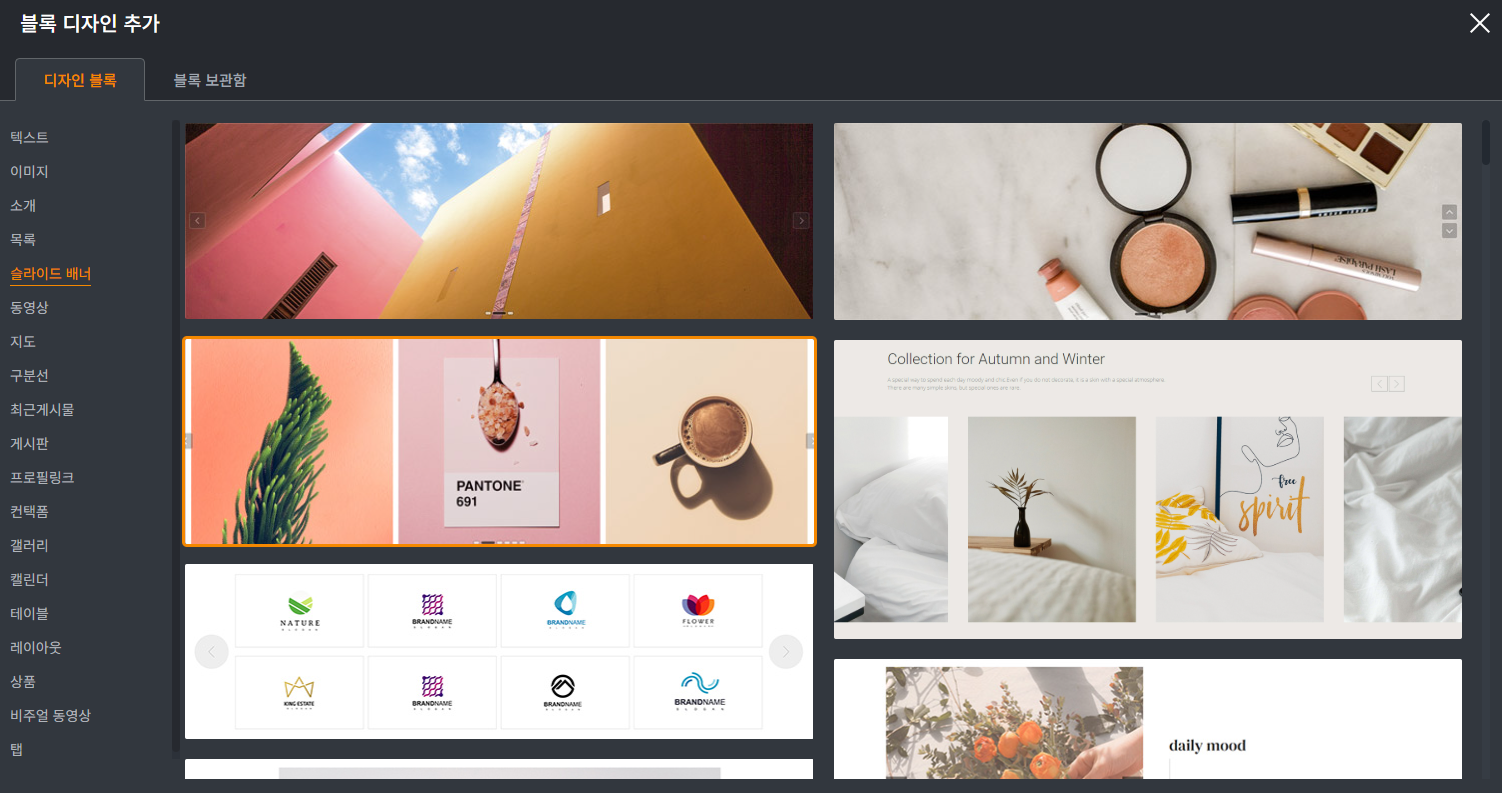 블록설정 > 슬라이드 콘텐츠 메뉴를 통해 슬라이드 배너에 사용할 이미지의 권장 사이즈를 확인하고 이미지를 변경할 수 있어요.