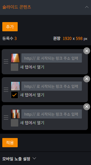 모바일 노출 설정 메뉴를 통해 모바일 화면에 노출되는 비율을 변경해 보세요.