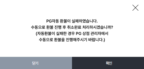 만약 자동 취소가 실패했다면 PG관리자 / 네이버페이 관리자 / 토스페이 관리자에서 수동으로 환불을 진행해 주세요.