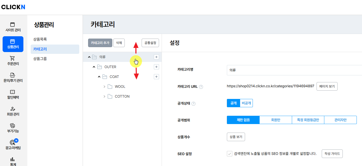 카테고리는 4차까지 설정할 수 있으며 카테고리 주소는 변경할 수 없습니다.