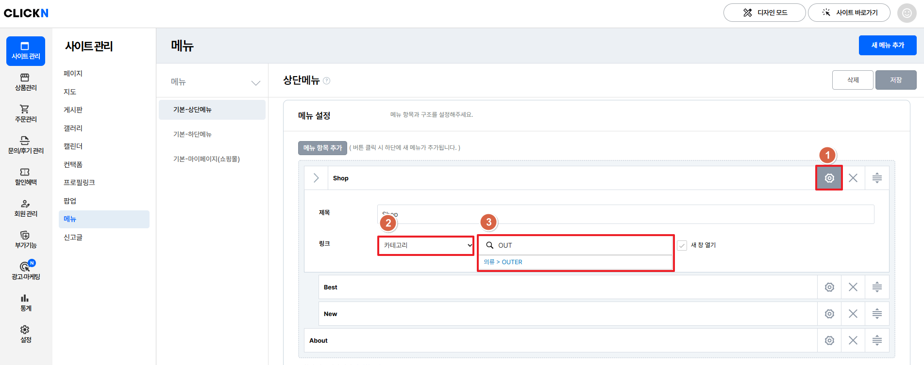 사이트 관리 > 메뉴로 접속하여 상품을 노출할 메뉴의 설정 클릭