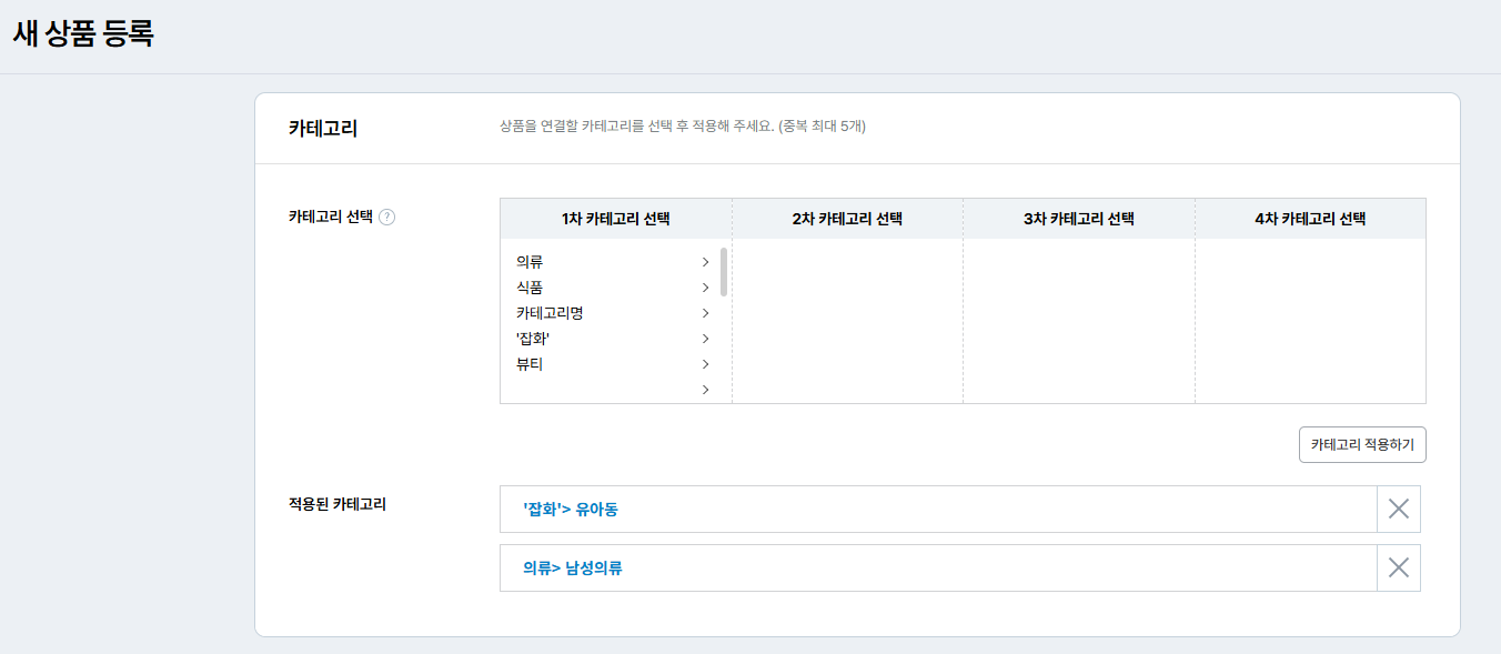 카테고리 설정을 완료해 주셨다면 상품 등록시 상품과 연결할 카테고리를 지정하고,