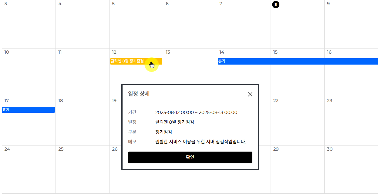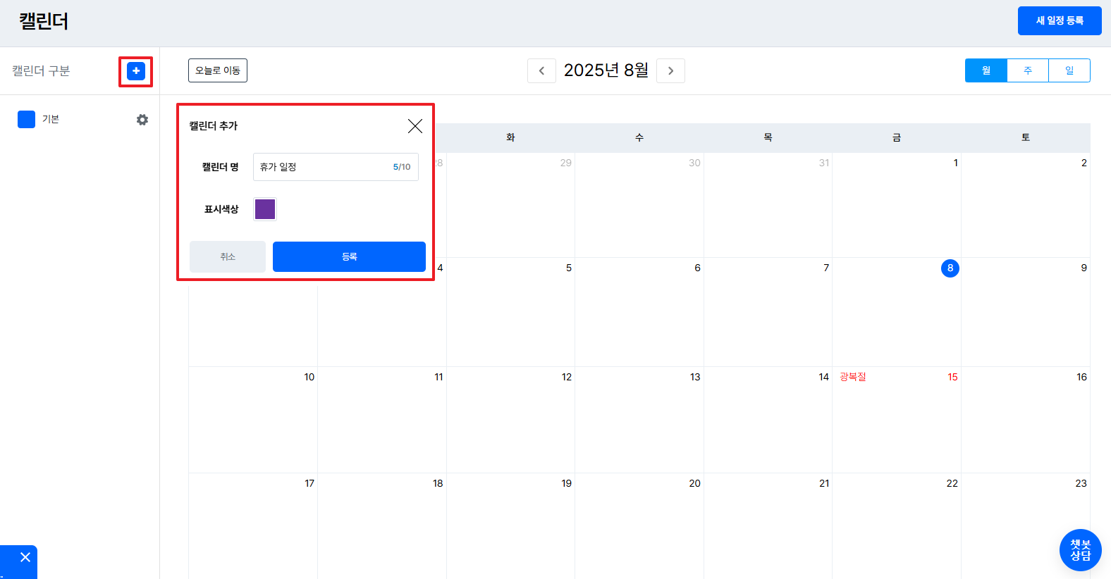 날짜를 클릭하거나 우측 상단 새 일정 등록 버튼을 통해 상세 일정을 등록할 수 있어요.
