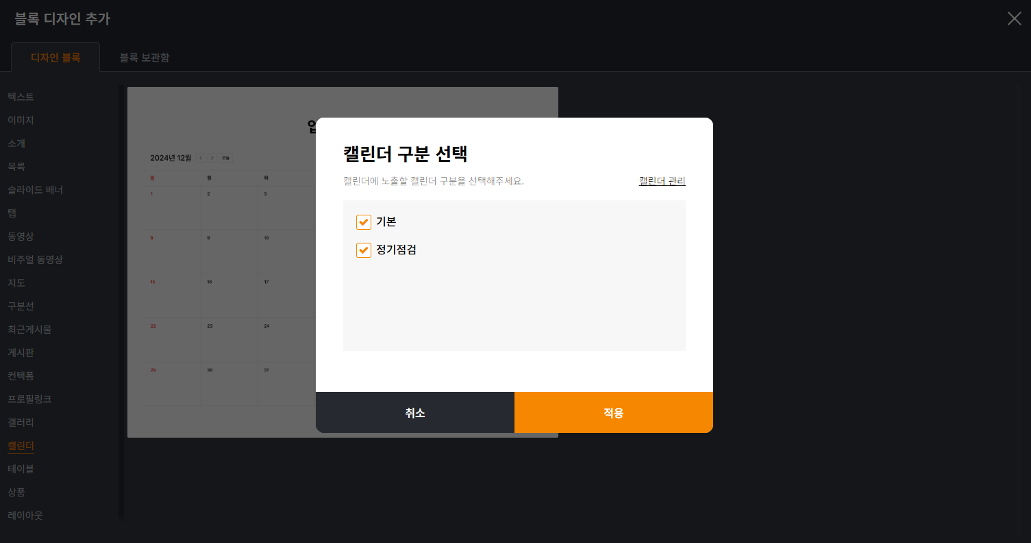 캘린더에 일정을 등록해 주셨다면 디자인 모드에서 캘린더 블록을 추가해 주세요.
