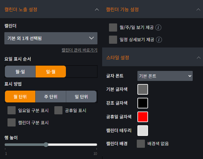 캘린더 블록의 블록 설정으로 접속하면 캘린더 노출 설정, 기능 설정, 스타일 설정을 수정할 수 있어요.