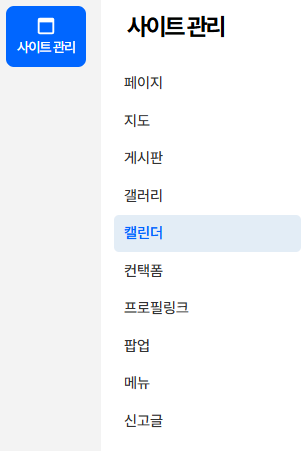 관리자 페이지 > 사이트 관리 > 캘린더 메뉴에서 캘린더 관리를 위한 캘린더 구분을 설정하고,