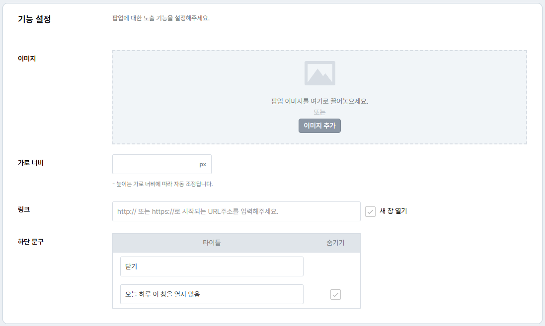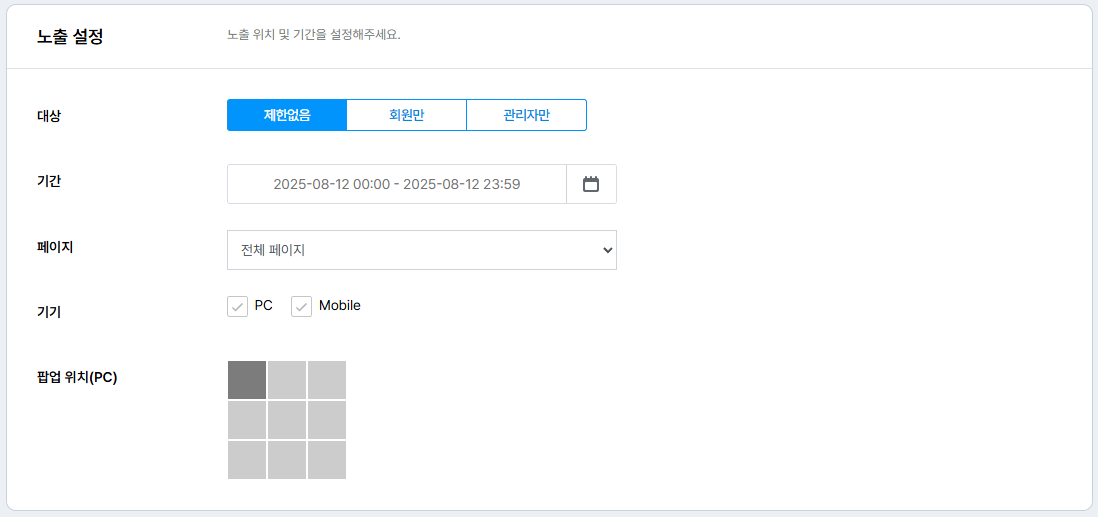 팝업의 노출 위치와 기간, 노출 기기를 설정할 수 있어요.