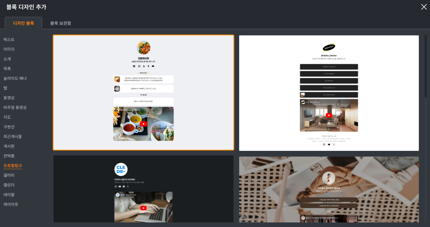 여기에 블록추가 > 디자인 선택 화면 > 프로필 링크 블록의 디자인을 선택하고 추가해주세요.