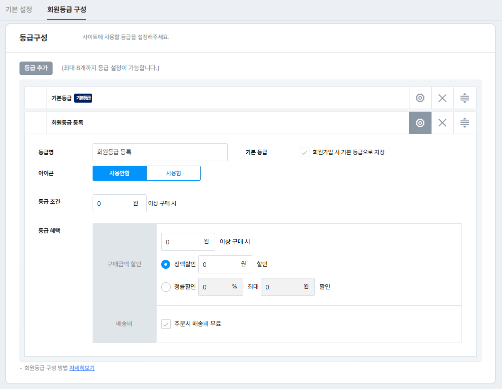 기본 등급 : 최초 회원가입 완료후 기본으로 부여되는 등급으로 지정합니다.